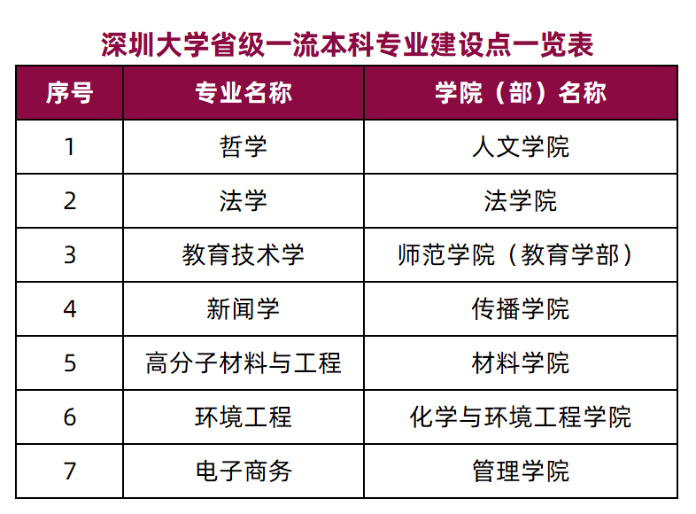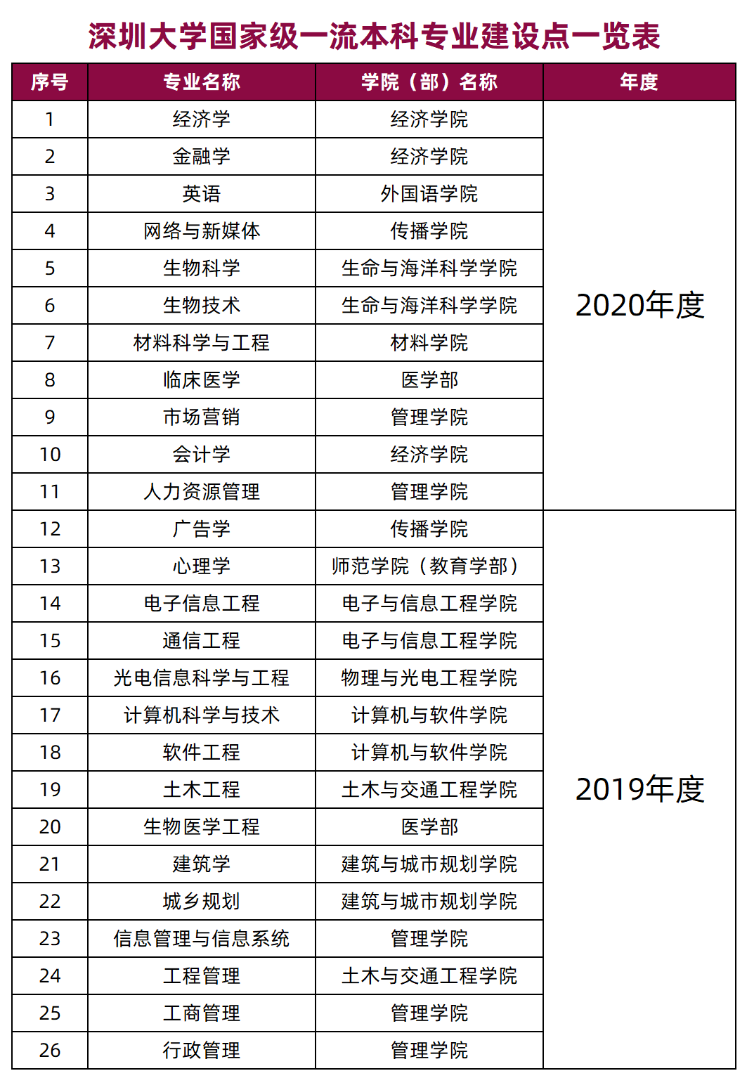 另外,近日教育部印发的《教育部办公厅关于公布2020年度国家级和省级一流本科专业建设点名单的通知》(教高厅函﹝2021﹞7号),深圳大学经济学等11个专业入选国家级一流本科专业建设点,哲学等7个专业入选省级一流本科专业建设点。截至目前,深大共有26个国家级一流本科专业建设点,7个省级一流本科建设点。