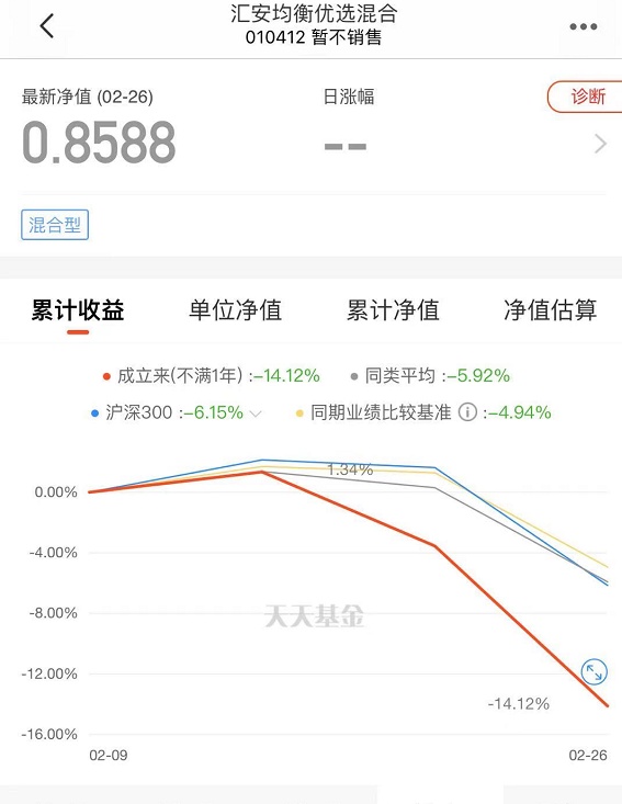 事情是这样的,一只叫汇安均衡优势混合的基金,在春节前不久刚成立,估计觉得踏空比亏损更难受,于是火速建仓,没想到春节回来之后,行情来了一个180°大转变,惨遭重锤,仅9个交易日亏掉近15%!