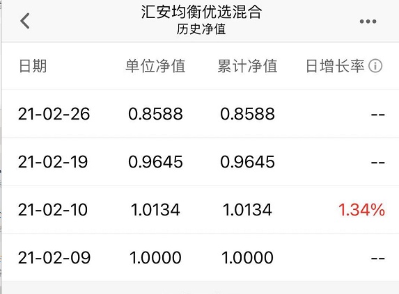 具体是怎样的?我们来看看净值表现,2月9日开始基金生效,10日净值增长1.34%,随后就过上春节,春节回来之后分别在19日、26日公布净值,一下子就回撤到了0.8588,要知道,节后到26日,一共才6个交易日,就跌去了15%!