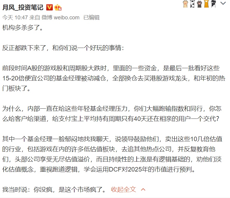 沣京资本基金经理吴悦风今天在微博分享了一个看法:有基金公司内部一直在给基金经理压力,你们大幅跑输指数和同行,你怎么给客户给渠道,给支付宝上平均持有周期只有40天还在相亲的用户一个交代?其中一个基金经理一脸郁闷地找我聊天,说领导鼓励他们,卖出这些10几倍估值的行业,包括游戏在内的许多低估值板块,去追其他热点公司,并反复教育他们,头部公司享受无尽估值溢价,而且持续性的上涨是有逻辑基础的,劝他们淡化估值概念,重视跑道逻辑,学会运用DCF对2025年的市值进行预判。