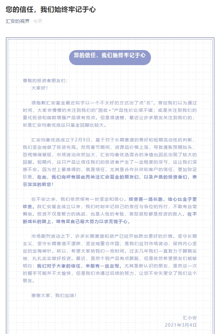 另外,汇安基金晚间撰文《您的信任,我们始终牢记于心》对投资者表示歉意,文章指出,基金回撤让汇安基金深感不安。汇安基金表示,尽管该基金大幅回撤,但仍坚信许多长期赛道和资产已经跌出更好的价格,并恳求投资者再给一些时间。