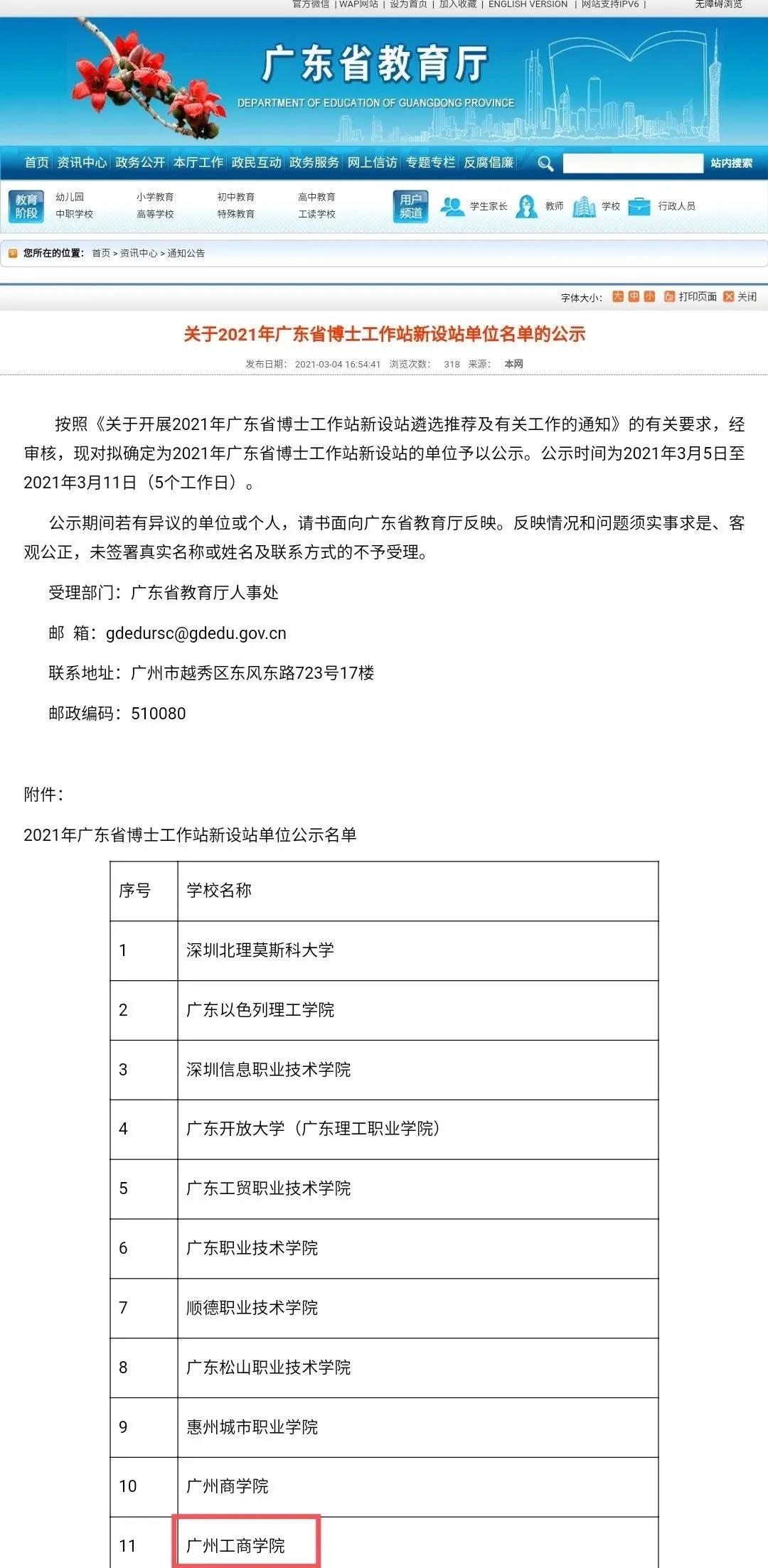 3月4日,广东省教育厅官网发布了关于2021年广东省博士工作站,此次名单公示的时间,为2021年3月5日至2021年3月11日(5个工作日)。新设站单位名单的公示有15个学校上榜,其中广州工商学院也在名单之上。