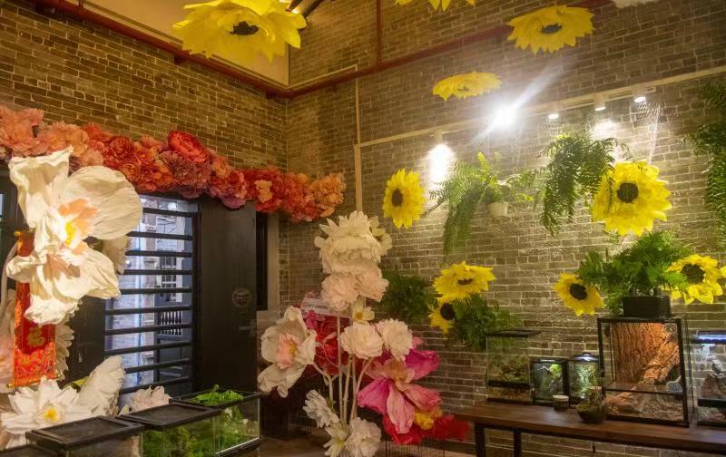 广州仔吴贵华的工作室十分吸引眼球,硕大的、金黄的向日葵纸花悬吊古朴的青砖民居屋顶,一旦路过便想一探究竟。这是一家以纸花装置艺术展出、教学,热带雨林缸体展出及教学为特色的个性化工作室,此时正在布置的是“向阳而生”纸花装置展。吴贵华生长在广州海珠老城区,他喜欢泮塘的古朴气息。吴贵华认为,外来与本土、新潮与传统都需要融合。“我们还在装修,就有村民来张望 ,对工作室充满好奇,有些村民说,他们小时候也折过皱纸花。”他认为,村民始终是这里的主人公,他希望外来与本地能和睦相处,年轻人的新文化能与传统民俗融合,因此把工作室叫做“和馆”。据悉,对于下一期布展,他还计划把舞狮队请进工作室,让他的纸花艺术成为泮塘醒狮文化的衬托。