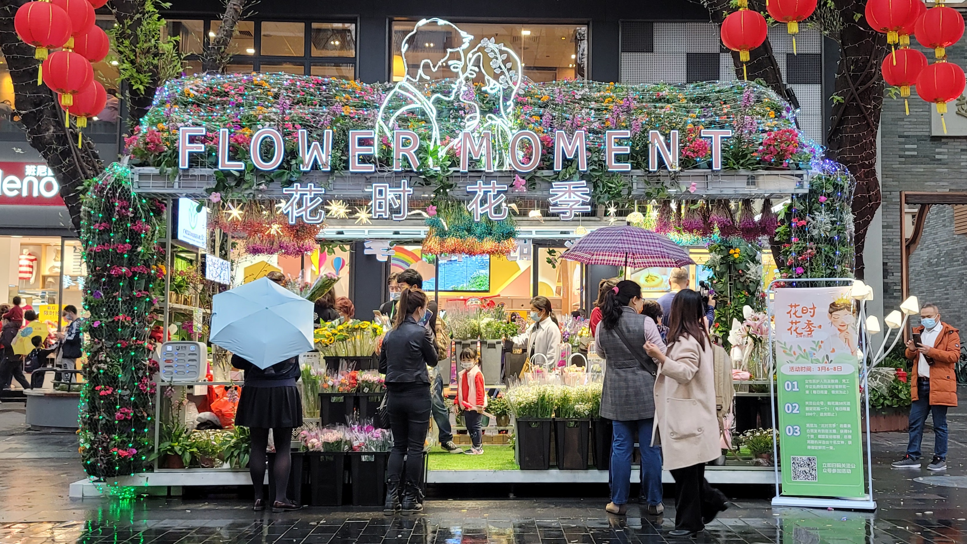 3月6日,在北京路步行街,一辆由鲜花围绕组装起来的大型花车“突然降临”,开放式的店铺,包装小巧精致的洋甘菊、康乃馨、向日葵、小雏菊吸引了不少路过的市民、游客的“打卡”拍照,购买。