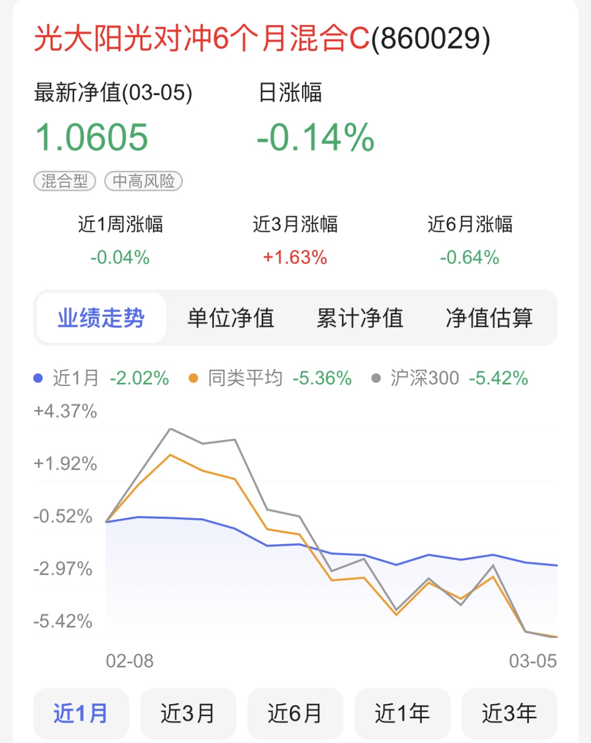 但是前几天点进去看,陈华发现了本金出现亏损,这才发现光大阳光对冲6个月持有混合c,实际是基金产品,而且还是投资股票这种高风险领域的基金。