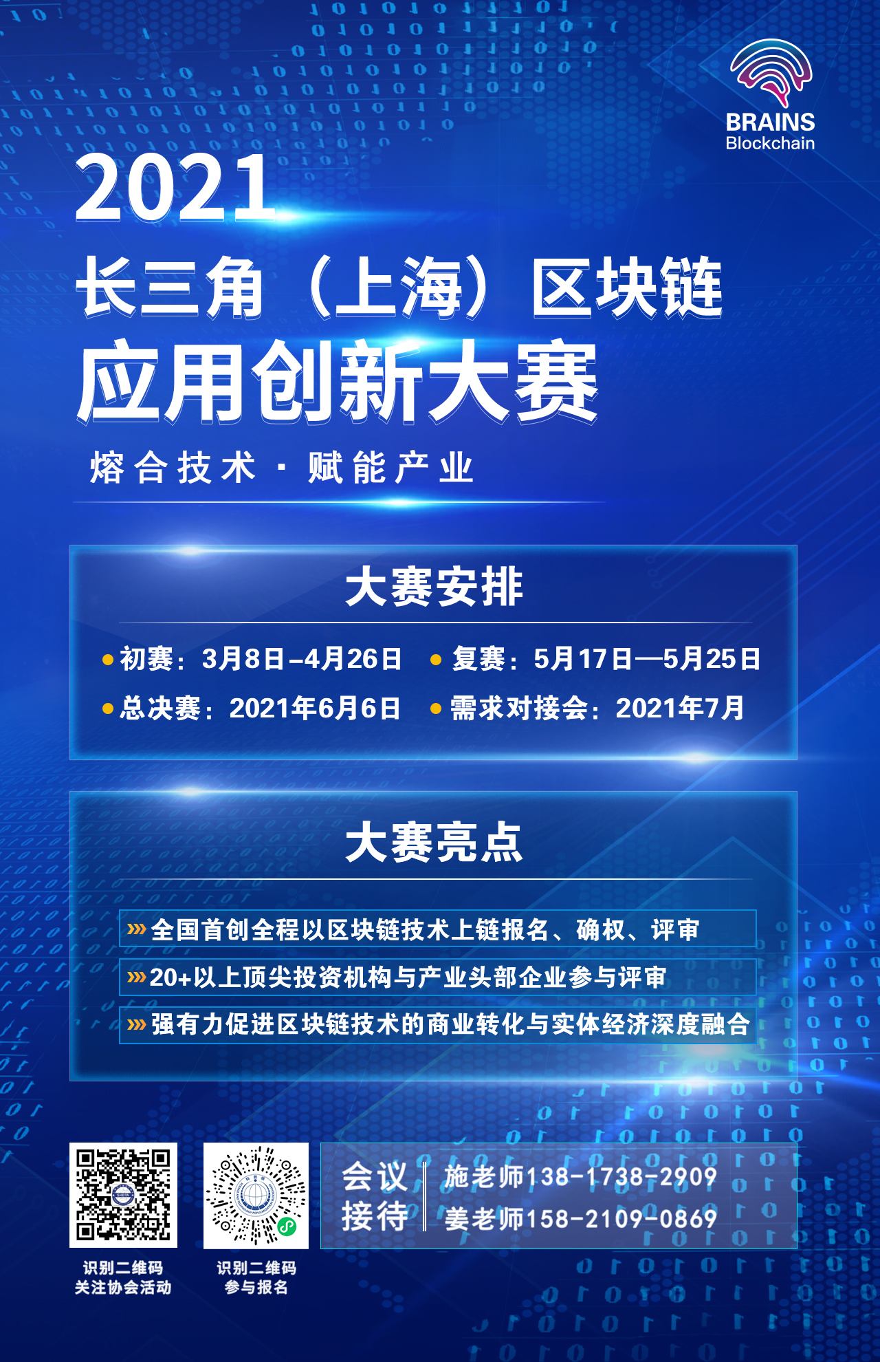 2021年长三角(上海)区块链应用创新大赛于3月8日正式拉开帷幕。此次大赛由上海区块链技术协会主办,以“熔合技术、赋能产业”为主题,参考治理数字化、经济数字化、生活数字化三大方向,在金融、司法、知识产权、航运、医疗大健康、农业、文旅等领域,围绕区块链的技术、区块链的产业规划布局、区块链的应用案例等方面综合展开。