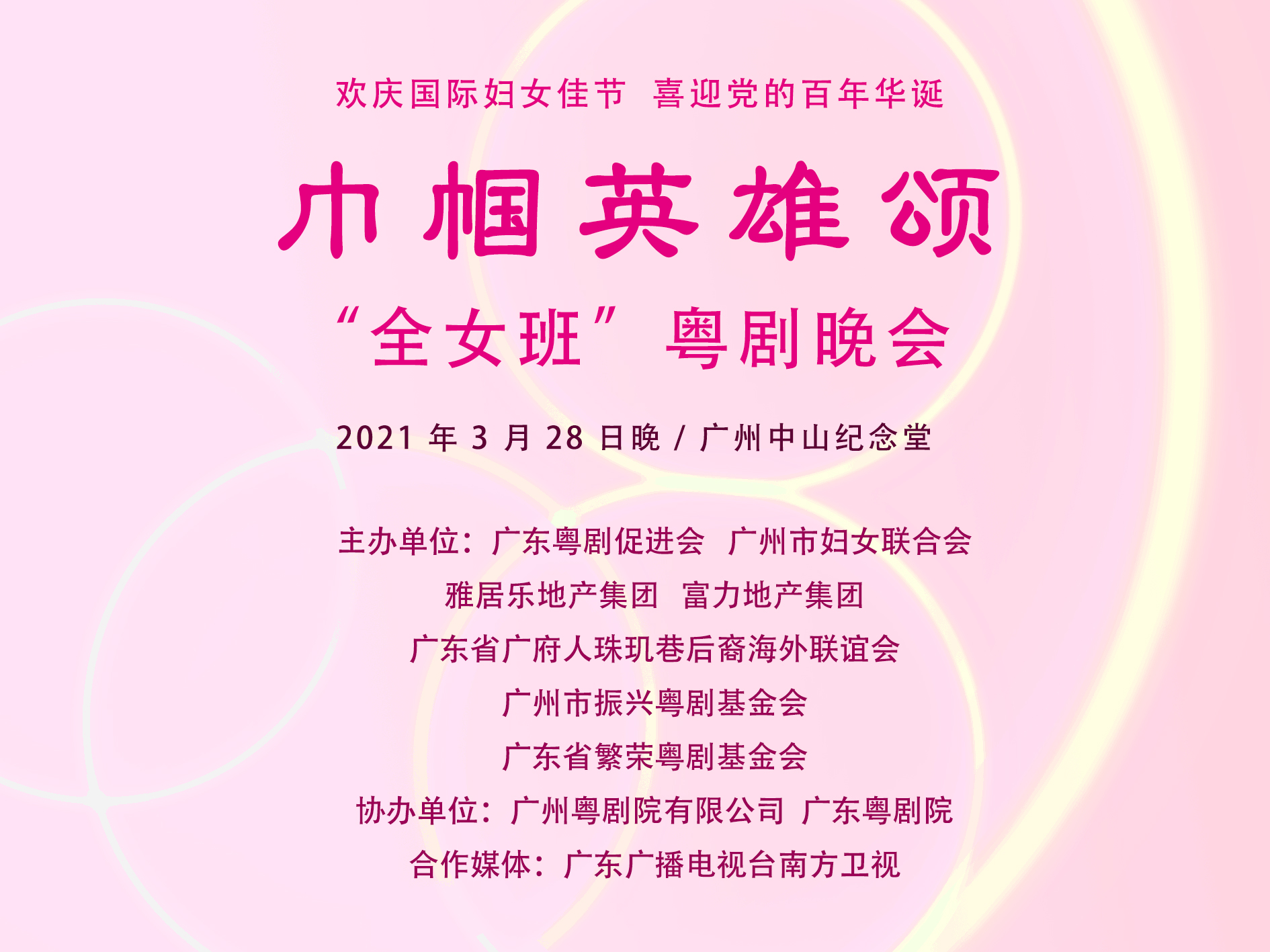 由广东粤剧促进会、广州市妇女联合会、雅居乐地产集团、富力地产集团、广东省广府人珠玑巷后裔海外联谊会、广州市振兴粤剧基金会、广东省繁荣粤剧基金会联合主办,广州粤剧院有限公司、广东粤剧院协办的《巾帼英雄颂》“全女班”粤剧晚会,将于3月28日晚在广州中山纪念堂隆重上演。这是一台以“全女班”(登台表演的全为女演员)演绎、别开生面的粤剧晚会,“全女班”的表演形式在粤剧舞台上也是数十年难得一见!