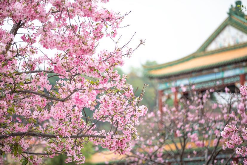 宝墨园在临湖轩榭、亭台楼阁中广植了数百棵广州樱,碧波倩影,红粉芳菲。广州樱是我国自主培育、由城市名字命名的本土樱花品种,适宜在岭南湿热的气候中培植生长。