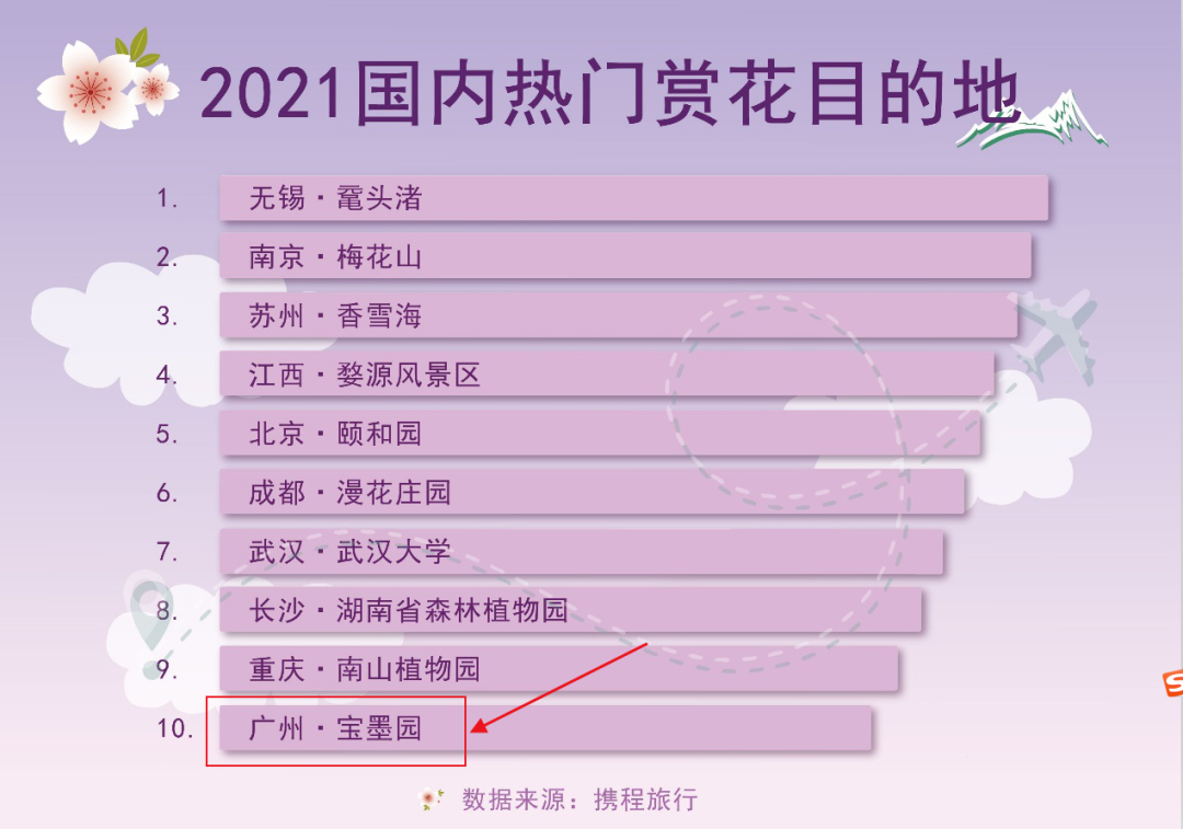 宝墨园与无锡鼋头渚、江西婺源风景区、北京颐和园、武汉大学等全国知名赏花胜地一同入选2021全国十大热门赏花目的地。广州素有“花城”之美誉,宝墨园作为广州唯一入选的景区,再一次擦亮广州“花城看花”的旅游名片,为粤港澳大湾区文商旅融合发展增光添彩。