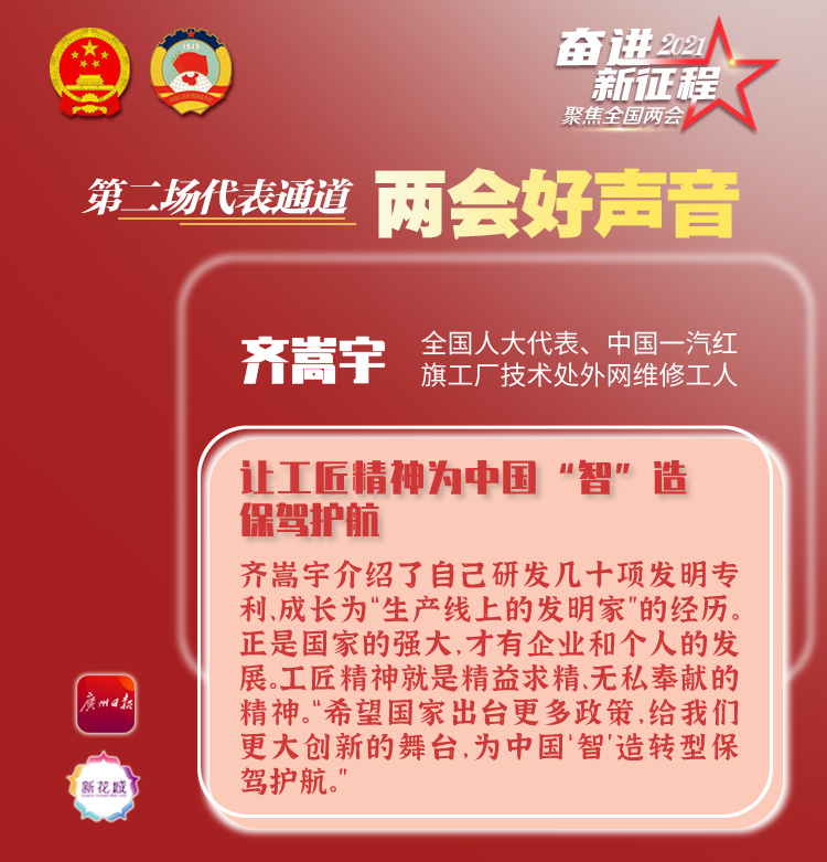 在3月8日的十三届全国人大四次会议第二场“代表通道”上,全国人大代表、中国一汽红旗工厂技术处外网维修工人齐嵩宇介绍了自己研发几十项发明专利、成长为“生产线上的发明家”的经历。正是国家的强大,才有企业和个人的发展。工匠精神就是精益求精、无私奉献的精神。“希望国家出台更多政策,给我们更大创新的舞台,为中国‘智’造转型保驾护航。”