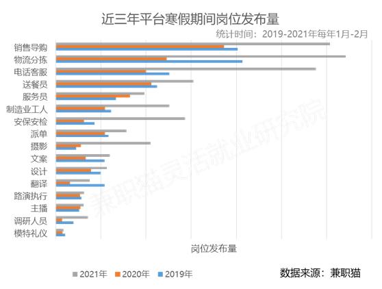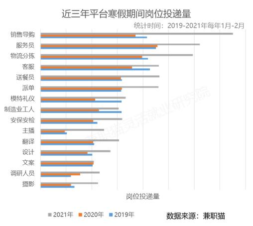 网约车司机、互联网营销师、骑手……随着新业态的发展,灵活就业人群也愈发庞大。3月8日,兼职平台(兼职猫)发布《2021寒假工兼职数据报告》显示,2021年1-2月(寒假期间),销售导购、物流分拣等服务型兼职岗位的投递量(应聘量)整体较往年上升了47.69%。报告认为,由于这类偏蓝领相关的职位,受众多为外来务工人员,今年春节多数人选择就地过年,因此也衍生出了较多的兼职需求。