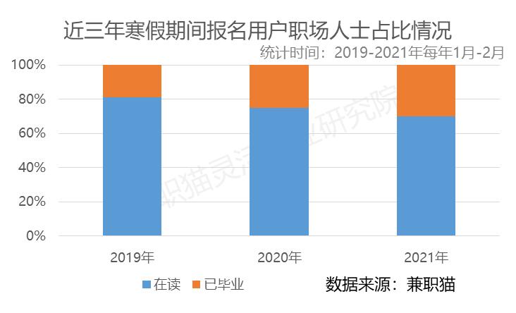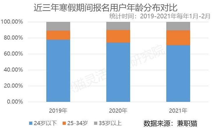 数据还显示,2021年平台25岁以上的用户较往年占比有所上升,其中2021年占比为28.83%,2019年的占比为22%,2020年占比为25%。报告认为,这源于受到疫情的影响,25到34岁人士经济压力比往年增加,对于兼职的需求较往年上升;此外,部分职场人士在春节期间响应号召就地过年,对于兼职的需求也较往年上升。