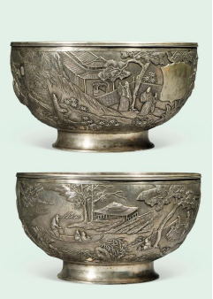 19 世纪 银制高浮雕高士图大碗 D:29cm