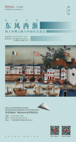 3月11日-16日,“东风西渐——海上丝绸之路与中国社会变迁”展览在华艺国际文化艺术中心举行。展览以“清朝—近代”广东与世界贸易体系为背景,以广州十三行销往世界的外销商品为展示重点,通过广彩瓷器、各类外销画作、广绣、石湾窑公仔、珐琅彩银器等百余件(套)文物精品,全方位地展示广州十三行在海上丝绸之路中的地位和作用。
