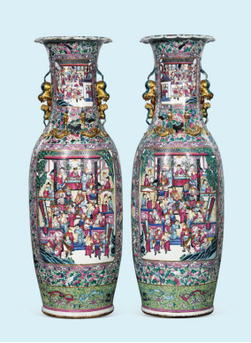 清乾隆 广彩锦地开光仕女婴戏图堆塑花枝耳狮钮对瓶(一对)