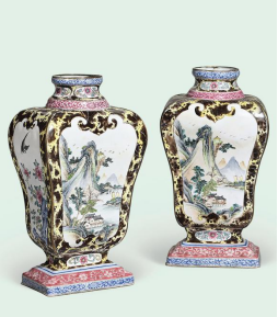 18 世纪 铜胎画珐琅山水花鸟图方尊(一对) H:24.5cm