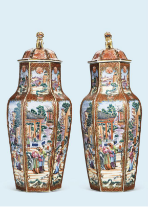 清乾隆 广彩高浮雕四妃十六子图六方狮纽盖瓶(一对) H:54cm