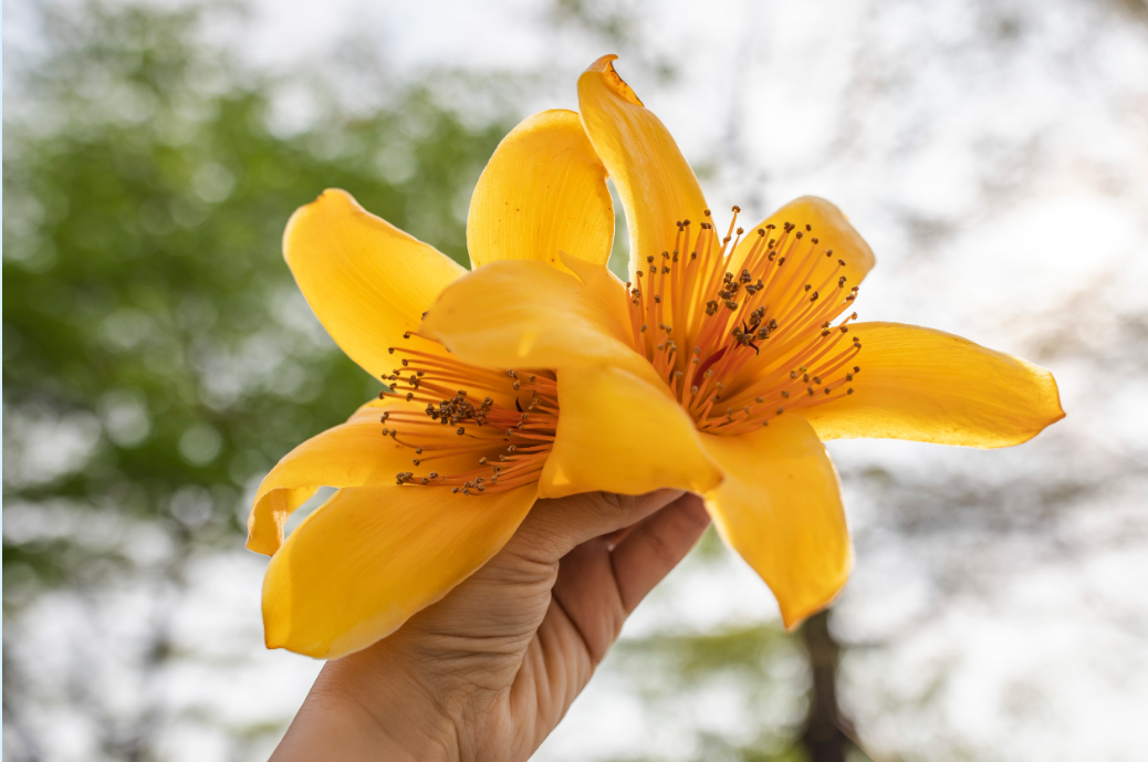 地上则掉落了很多金黄色的木棉花,拿起来一看,花朵也与红色木棉类似,有5片花瓣包含着中间的花蕊构成,只是颜色是金金黄色。街坊告诉记者,今年的金黄色的木棉花绽放的特别艳丽,最美的时刻是一个星期前,每天吸引了很多人驻足观望;前一阵下雨,金黄色的木棉花打落了一地。