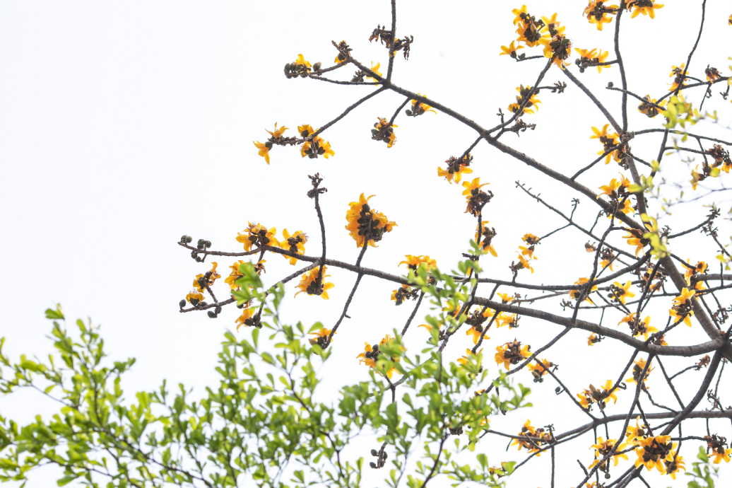 一株木棉树开出金灿灿的黄色花朵,