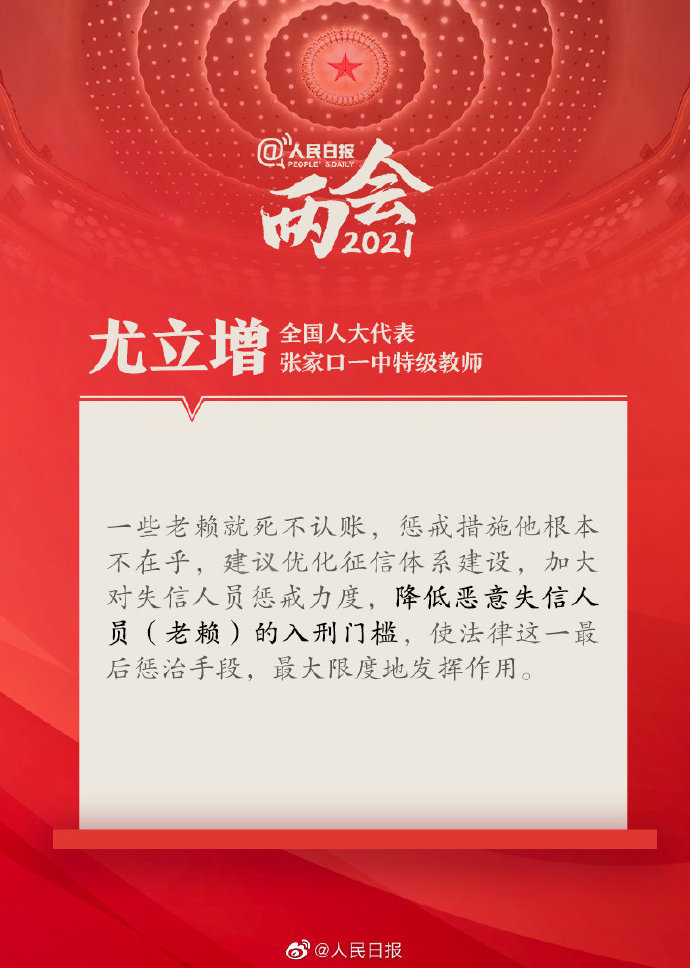 “欠债不还、恶意失信已成为社会的一个毒瘤,有统计显示,借钱不还的失信人员主要以20-30岁人员为主,并且正在走向多样化。”全国人大代表、张家口一中特级教师尤立增建议,优化征信体系建设,加大对失信人员惩戒力度,“降低恶意失信人员(老赖)的入刑门槛”。