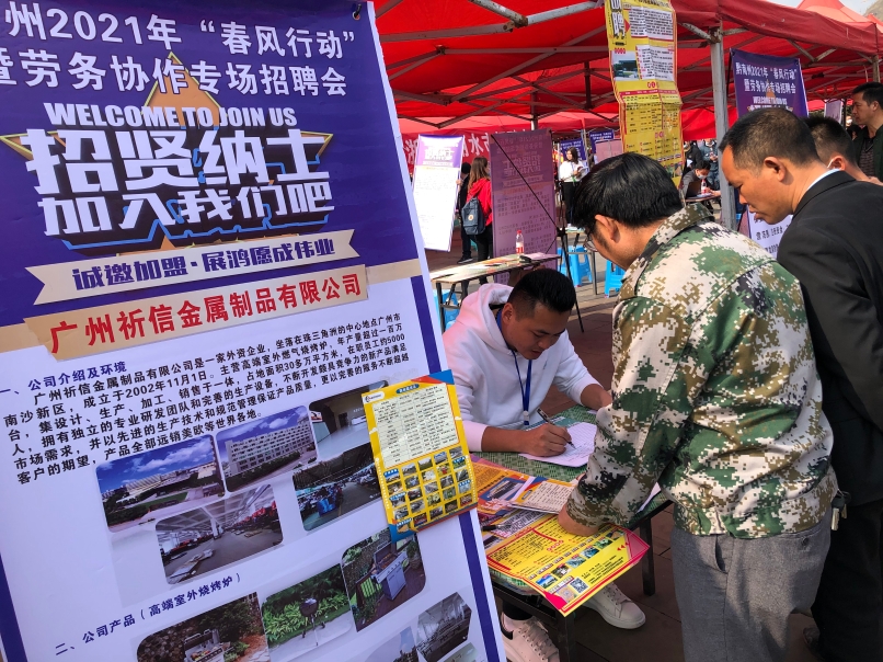 据悉,本次劳务对接招聘活动,是“春风行动2021”专项行动中援企稳岗的重要活动内容,广州市锦兴纺织漂染有限公司、广州华凌制冷设备有限公司、广州祈信金属制品有限公司、艾利(广州)包装系统产品公司、广州奥昆食品有限公司等5家区内重点用工企业随队参加,共提供979个工作岗位,招聘岗位以一线生产岗位为主,其中不乏研发技术员、项目工程师、模具主管等管理岗位。