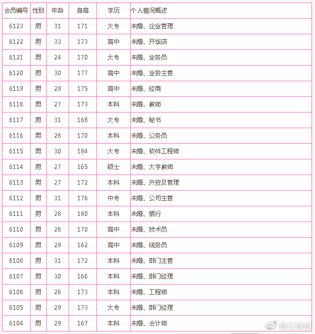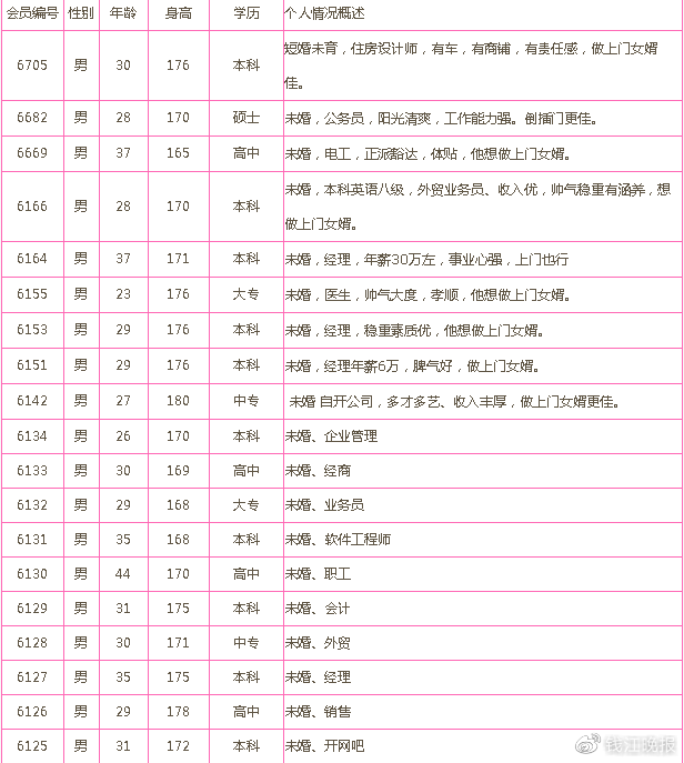 目前,该婚介所在官网上发布有132位招婿女会员与43位入赘男会员的相关信息。综合这些个人信息与李继延的讲述,萧山赘婿来自全国,如湖南、湖北、河北、安徽、江西、江苏、云南等,他们的年龄普遍集中于25岁到30岁,职业大多是各类工程师、技术员、经理,也不乏大学教师、公务员、企业管理层及创业者。从学历来看,基本是大专以上,其中,本科生最多,占比达到三分之二,同时,不乏研究生。