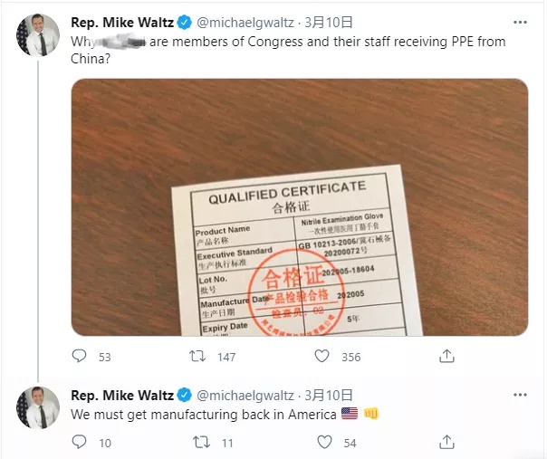 当地时间10日,美国知名反华政客、共和党众议员迈克·沃尔兹(Mike Waltz)在推特上晒出一张“中国制造”的证书,并附文“究竟为什么国会议员和工作人员拿到的防护装备,都是中国产的?”