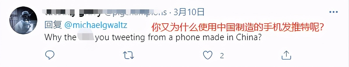 然而,美国网友们在评论区开启无情“打脸”模式,有人问沃尔兹:“那么你又为什么使用中国制造的手机发这条推文?”