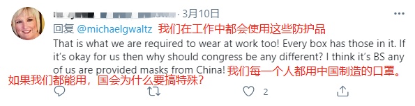 更有网友直接炮轰沃尔兹称,“我们在工作中都使用这些防护物品,国会凭什么搞特殊?你就是在说废话,其实我们每一个人都在使用中国制造的口罩。”