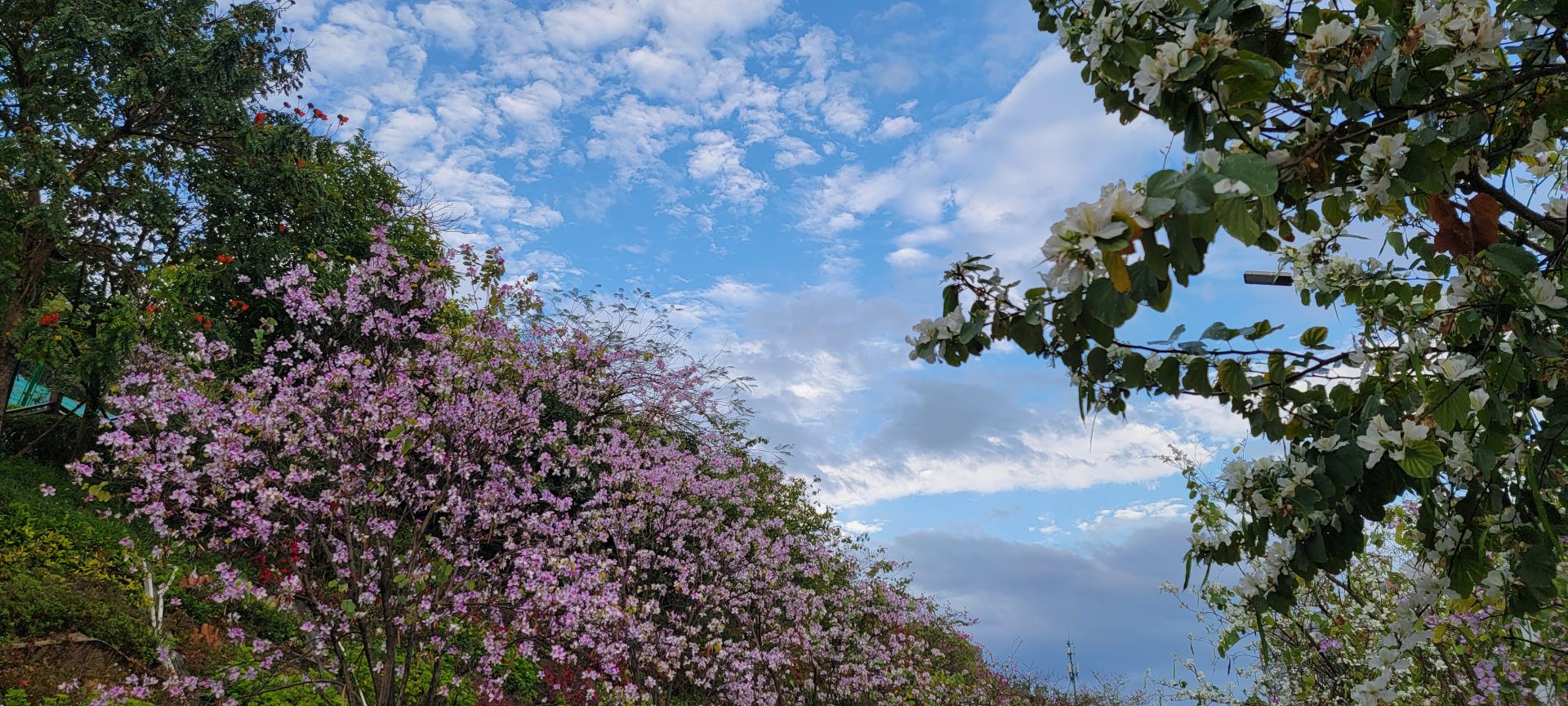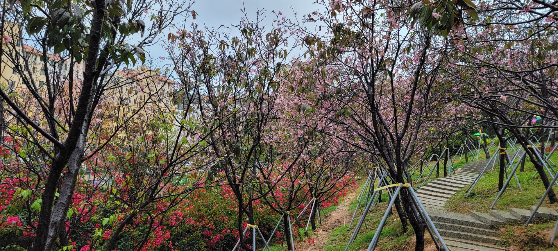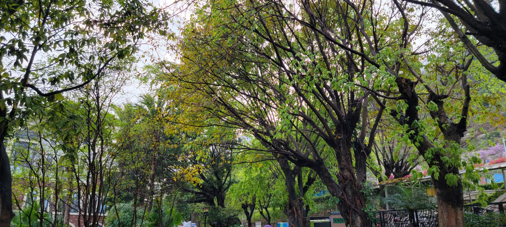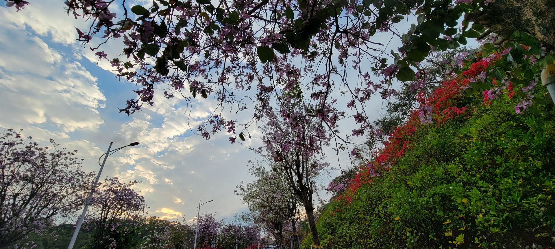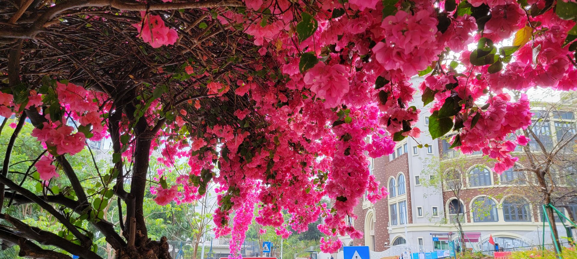 在南山区蛇口赤湾,有这样一所繁花绽放的公园,将春天藏在了港湾生活小区的人间烟火中。来到龙英路景观公园,抬头看眼前的天空,如儿时动漫中的笔触所绘就,道路两旁的繁花千树,正千朵万朵压枝低。游人的心情在春天里,随花朵一同盛开。