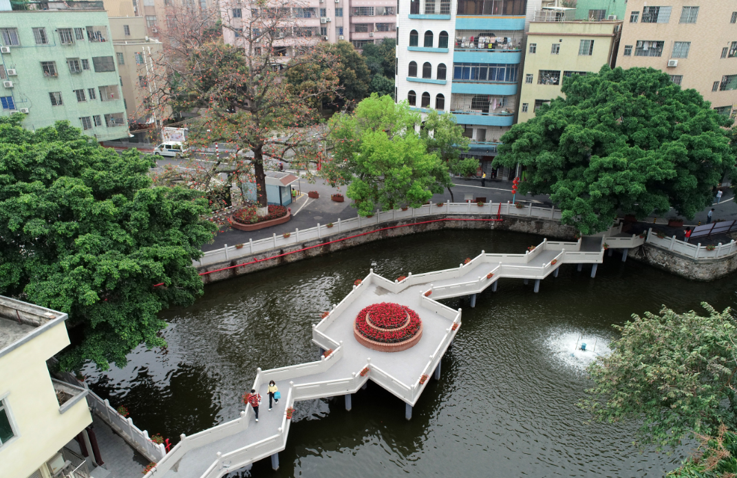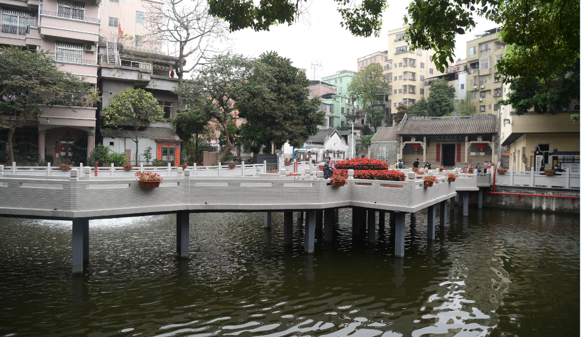 值得注意的是,在创建容貌示范社区过程中,科甲社区尊重当地历史文化,修复重建应和书院、兆宏家塾等老旧建筑,新建文化长廊,提升旧墟文化广场,重现“祠堂前、榕树下”村民议事;撰写编辑《科甲流光》,记录科甲历史变迁,书写抗日红色传奇。“我以前在这里读过书,现在全部按照‘修旧如旧’翻新了,虽然外观是全新的,但里面和以前也没多大的变化,这个保护得特别好。”当地居民钟伯介绍。此外,在空间优化上,科甲社区紧扣“一街一塘”,打造成片景观。对科甲商业街道路立面及建筑物外立面进行全面升级改造;在科甲“风水塘”修建观光碧道、修建观光石桥和石门楼,打造湖光美景,使“风水塘”变成了“风景塘”。