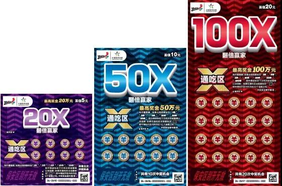 即开票“即买、即开、即兑”的特点简单好玩,趣味性强。票面上方的 “20X”“50X”“100X”的翻倍倍数极具视觉冲击力,也寓意小伙伴们能够收获奖金翻20倍、50倍、100倍的好运与欢乐。通吃区背后的金黄色“X”调动起每个人的好奇心,令人浮想联翩看见就有刮开它的冲动。