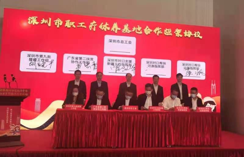 活动中,获得“全国脱贫攻坚先进集体”称号的深圳市总工会、广东省第二扶贫协作工作组、深圳市农产品集团股份有限公司发表了获奖感言。深圳市总工会与各前方指挥部、工作组签订对口地区深圳市职工疗休养基地合作框架协议。深农集团与对口帮扶地区代表签订消费帮扶助力特色产业发展战略协议。消费帮扶专馆、专区、专柜代表签署诚信经营承诺书。