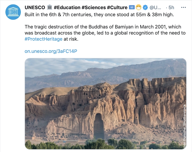 3月11日,联合国教科文组织发文纪念巴米扬大佛被炸毁20周年。文章认为,巴米扬大佛被毁的悲剧使全球认识到保护濒危文化遗产的必要性。“巴米扬山谷的大佛龛永远提醒着我们,我们有责任保护文化遗产;还提醒着我们,如果不这样做,我们的子孙后代将会失去什么。”
