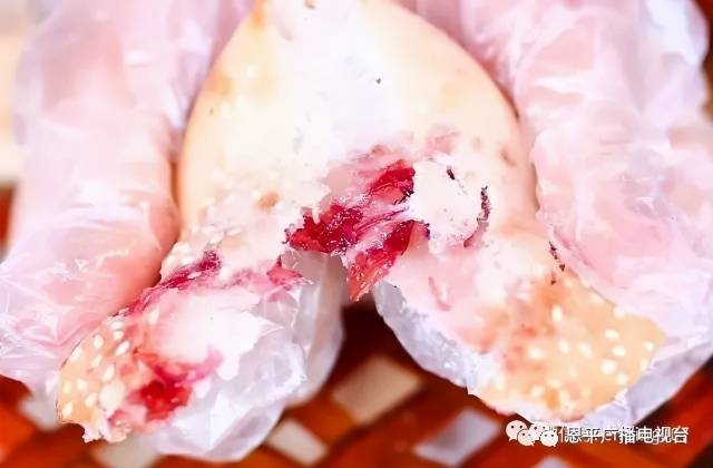 玫瑰花烧饼,以花入饼,里面包裹着的玫瑰花酱是将玫瑰花的花瓣用糖腌制成的,有滋补健肝脾功能,同时也是健美食品,长期食用能防止皮肤干裂、老化,有滋润皮肤功效。