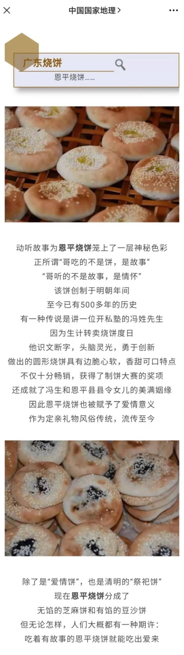 3月13日,《中国国家地理》微信公众号发布推文《中国的烧饼大省在哪里?》,搜罗了全国各省在历史长河中出现的有代表性的各式烧饼,以详实的历史、生动的语言探讨了烧饼是如何在中国出现、中国的烧饼大省又在哪里等问题,表现了中国人充满智慧的创造力,带读者认识了一个大国的饮食气度。其中,恩平人熟悉的恩平烧饼作为广东省的唯一代表“出战”!