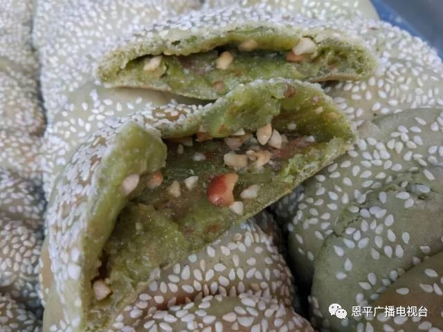 采用恩平当地新鲜的辣木,研磨成粉,加进面粉里面一起揉匀,再包入花生白糖陷;制作出来的辣木烧饼色泽呈淡淡的绿色,吃起来有点回甘,没有想象中的涩苦。