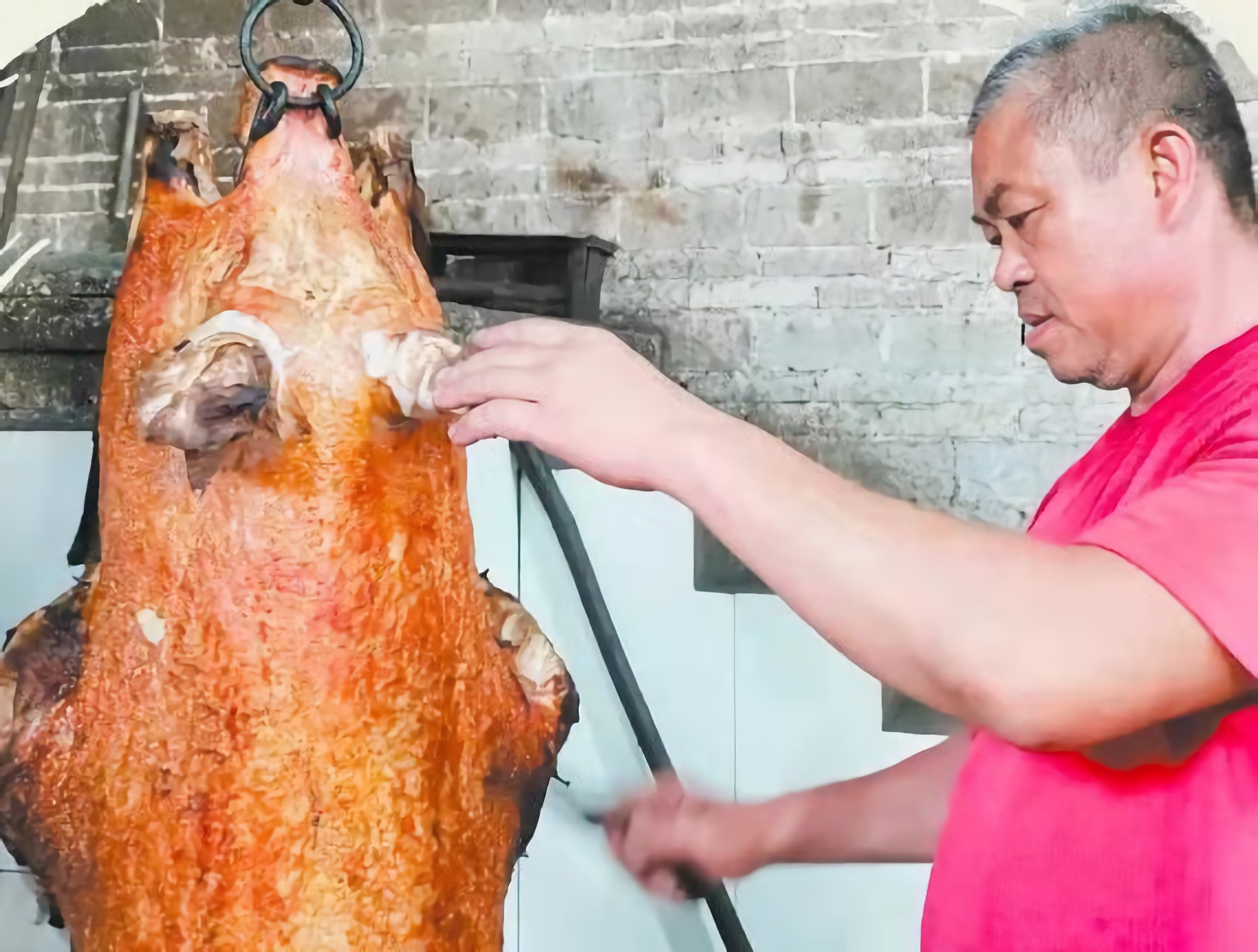 何国才说,烧猪这门技艺看起来简单,但实际上非常考验功力,从选材、腌制、火候到工序,每一个环节都非常关键,时刻要“察颜观色”。他通常选用100斤以上的瘦肉猪,宰杀好后冲洗干净,挂起来沥干水分,再进行剔骨和改刀,然后进行腌制工序。他说,猪肉腌制是烧猪的第一道工序,讲究“拍骨入味”,腌制两小时入味后,用尖刀在猪皮上插小孔,预防第一炉时猪身起大气泡。