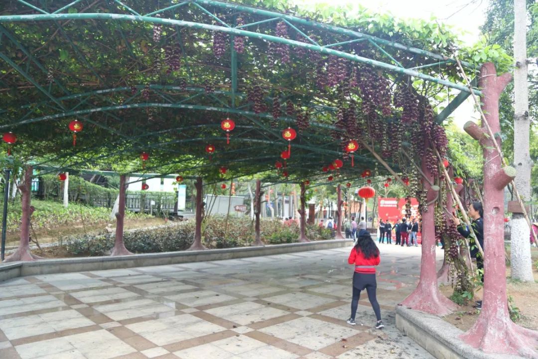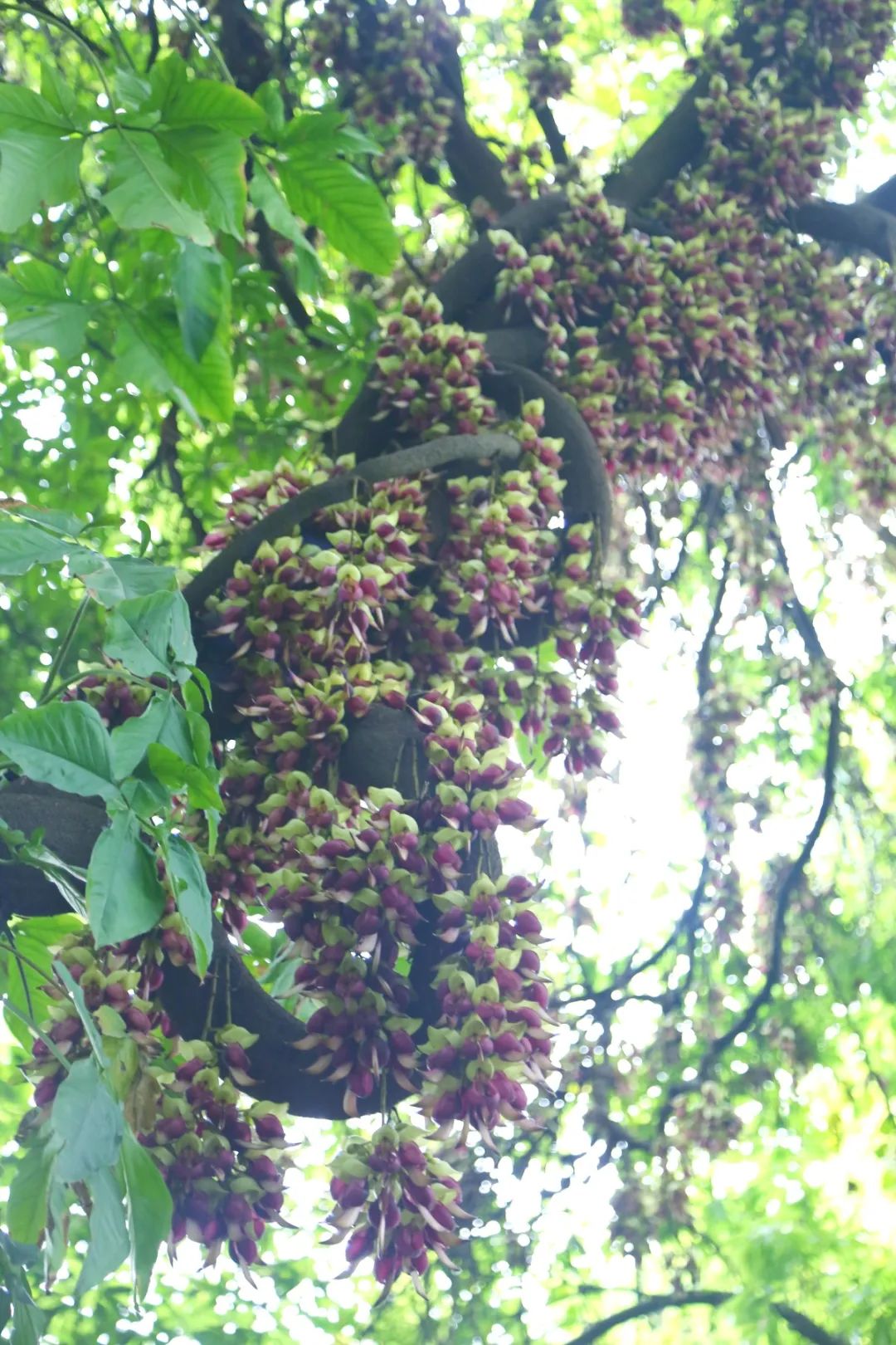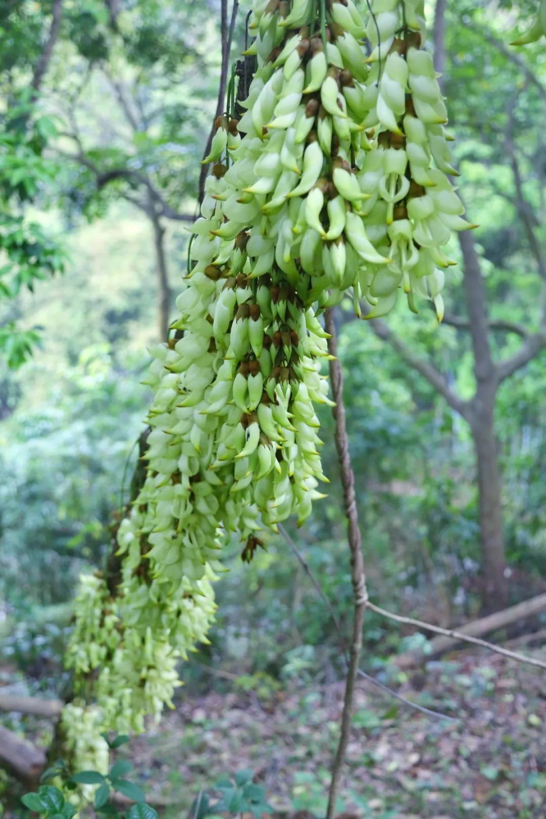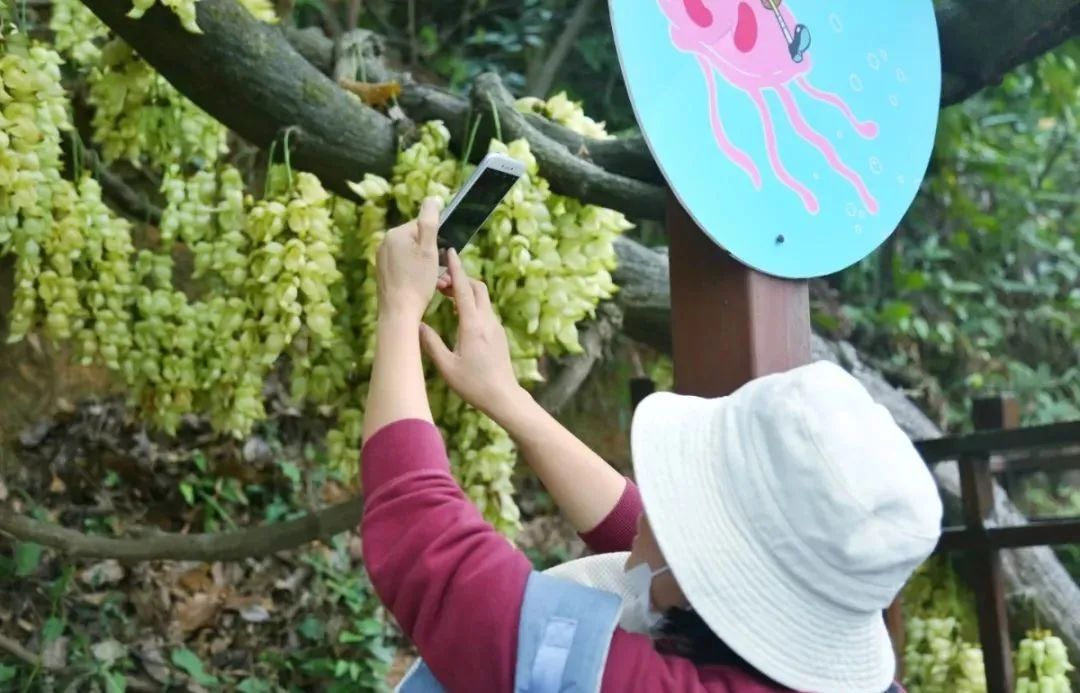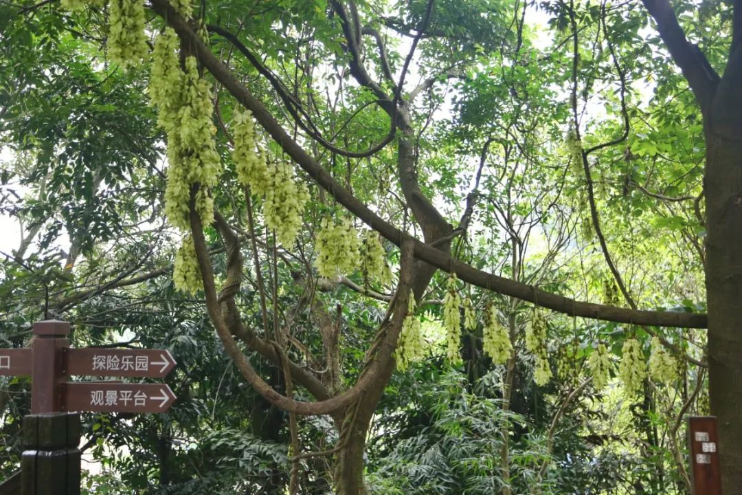 再往公园内的木质栈道走,沿途一棵棵粗壮的树干上悬挂着一串串绿色禾雀花,小巧玲珑的禾雀花绕着枝干,犹如百鸟栖枝,令人心驰神往。