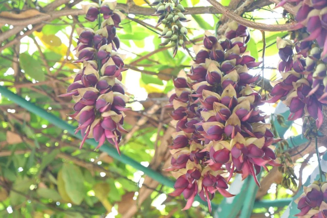 一进公园,远远就能看到一簇簇罕见的紫色禾雀花爬满了藤蔓的棚子,开得正旺。