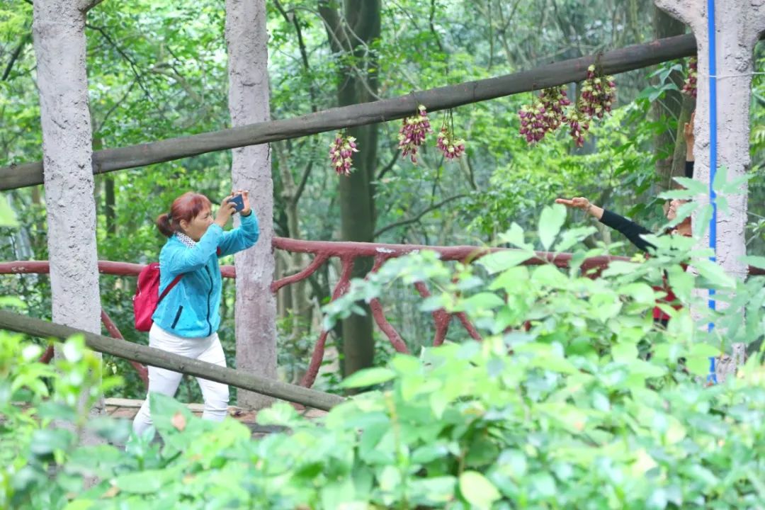 天鹿湖森林公园中的禾雀花观赏区主要分为四个区域,一、二区位于东广场木栈道上方延长山峰,三、四区位于公园西门片区。从东广场的景区入口进去左转,沿着架空栈道,走过蜿蜒的山路,沿山路爬山游览可以依次欣赏四个区域的禾雀花。