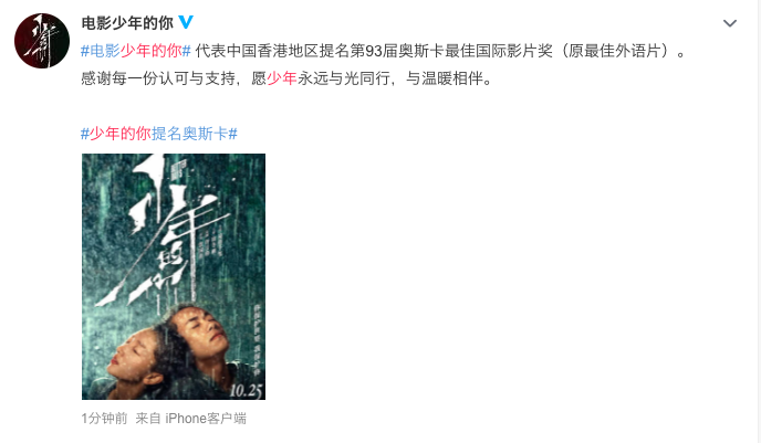 3月15日,美国电影艺术与科学学院公布第93届奥斯卡提名名单,《少年的你》提名最佳国际影片(原“最佳外语片”)。据悉,本届奥斯卡将于4月25日颁奖。