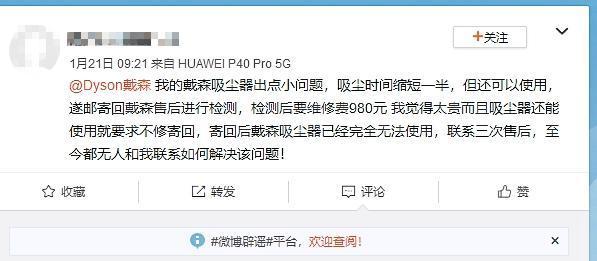 本报3月4日、5日《数千元吸尘器只用一次就发臭》、《同款吸尘器 海外正品不保修》报道曝光市民投诉戴森吸尘器只用了一次便发臭,而戴森客服要求他支付980元更换主机和滤网。戴森吸尘器电商平台戴森海外自营旗舰店购买的原装进口的戴森吸尘器不保修,且不同电商平台的戴森海外官方旗舰店的产品保修期不一样。报道推出之后,被腾讯、新浪、网易、搜狐、今日头条各大平台转载,在网上引起了热议。但对于上述报道,本报截止3月15日未收到戴森回应。