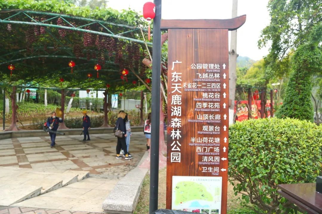 天鹿湖森林公园中的禾雀花观赏区,主要分为四个区域,一、二区位于东广场木栈道上方延长山峰,三、四区位于公园西门片区。从东广场的景区入口进去左转,沿着架空栈道,走过蜿蜒的山路,沿山路爬山游览可以依次欣赏四个区域的禾雀花。