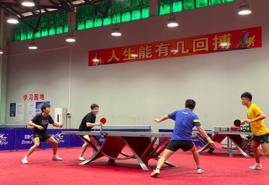 每天的训练之前,樊振东和队友们结伴从宿舍步行至球馆,热身之后开始进行有球训练。在这次预赛上,樊振东将与林高远搭档参加男双项目,而他在男团和男单项目已经直接获得了9月决赛阶段的入场券。广东男队另外一对男双组合是张超/周启豪,主教练李肇民安排他们进行一场队内赛,五局三胜制。这场队内赛的水平不是一般的高,双方在前四局战成2比2,馆内其他正在训练的队员都被比赛吸引,还不时为双方的精彩回合鼓掌叫好。最后,樊振东/林高远在决胜局以11比8险胜,在比赛结束之后,他们马上一起总结得失,训练态度认真严谨。