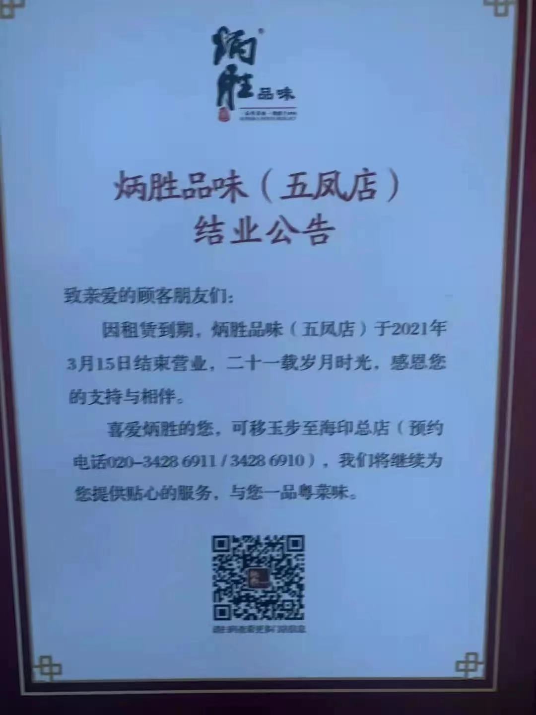 今天,广州日报·新花城记者留意到,炳胜品味(五凤店)在门店低调贴出结业告示,称店铺于3月15日正式结束营业,并欢迎食客移步到海印总店。该店已有21年历史,据公告显示,结业主要是因为租赁到期。