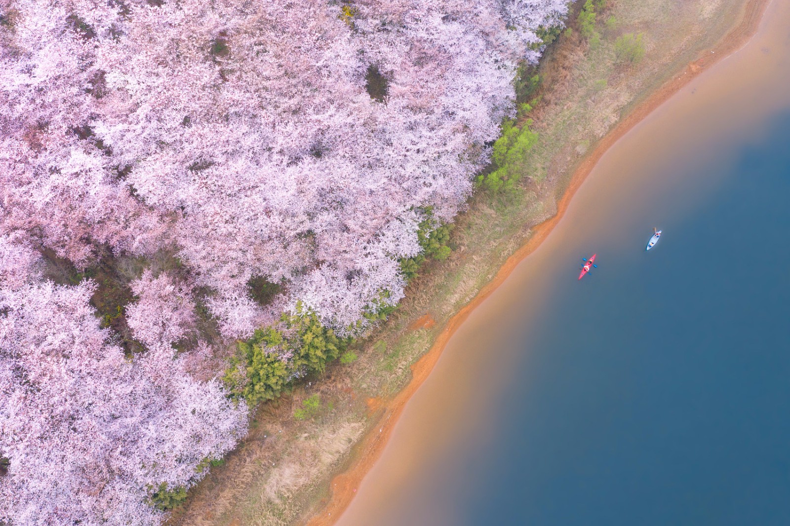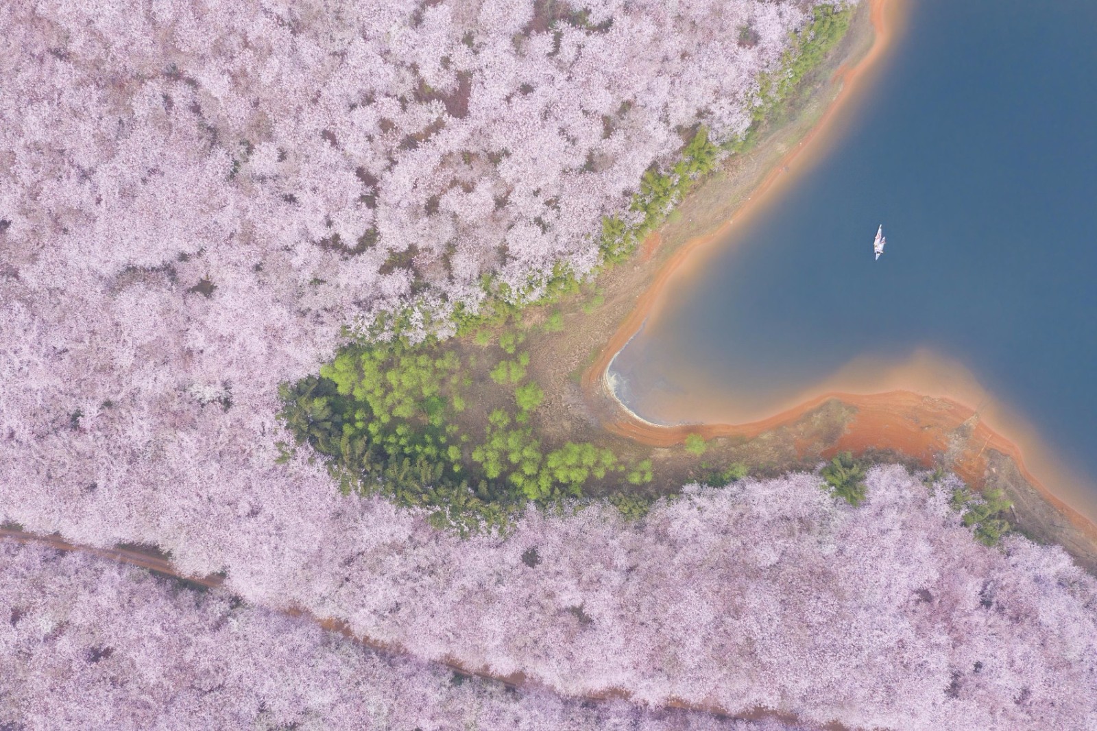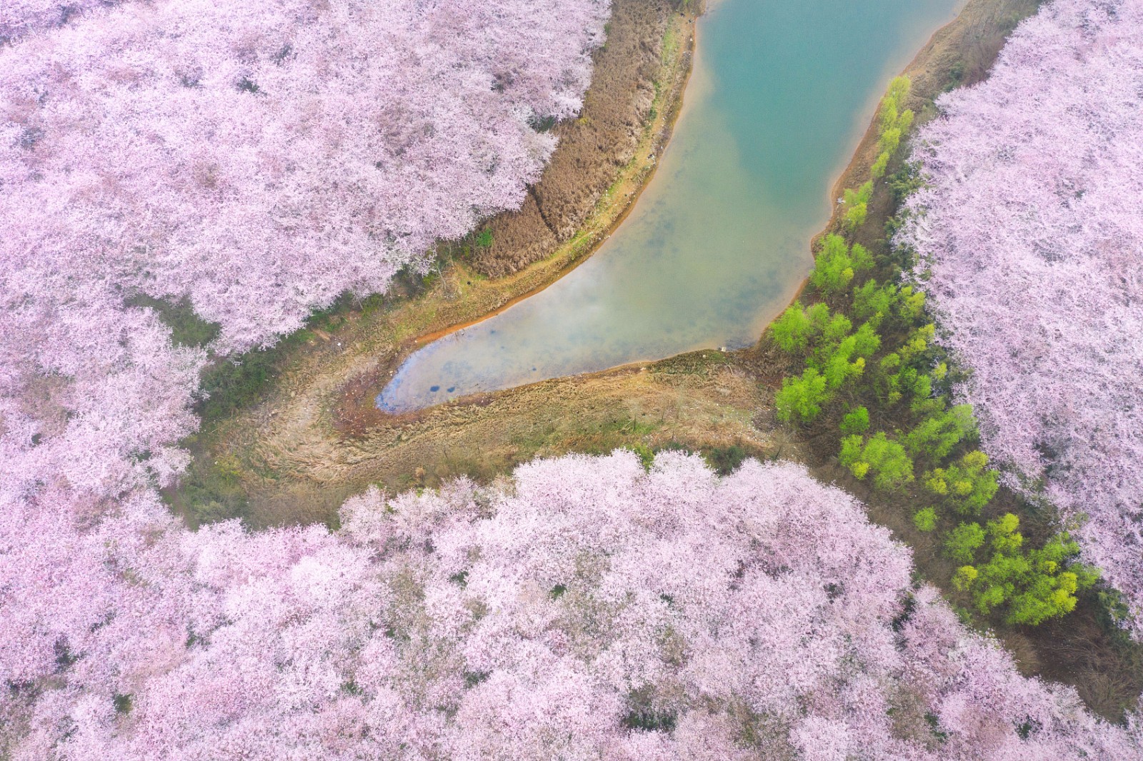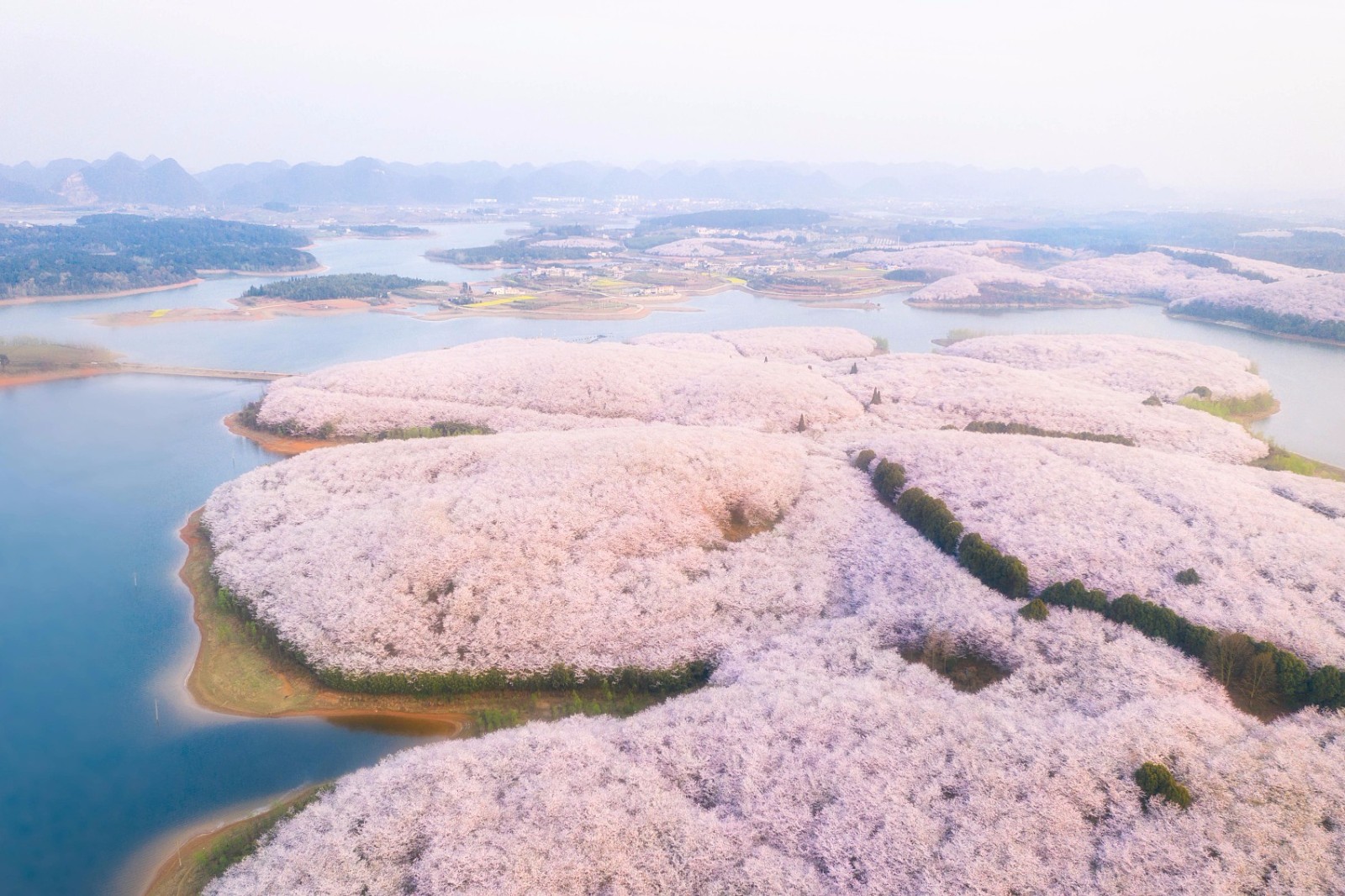 近日,贵州省安顺市,万亩樱花齐开放,形成粉色花海。