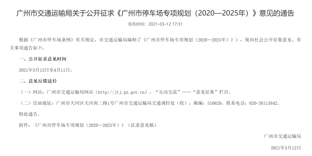 市民可通过广州市交通运输局网站(http://jtj.gz.gov.cn)或邮寄信函至广州市天河区天河南二路1号广州市交通运输局交通调控处(邮编:510620,联系电话:020-38113842)反馈意见,公开征求意见时间为2021年3月13日至4月11日。