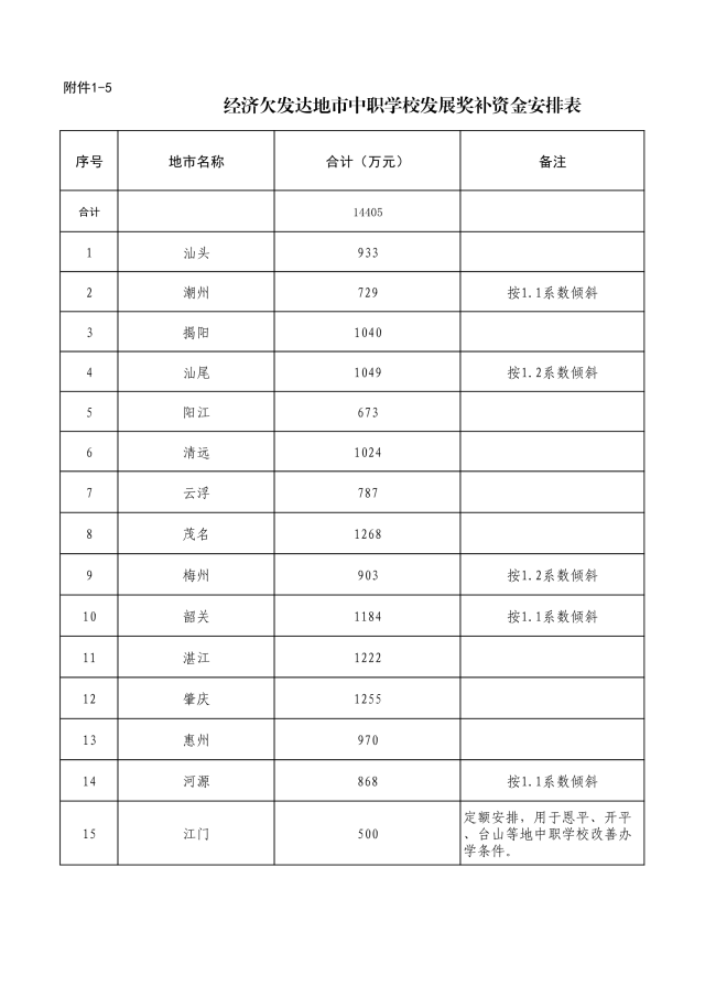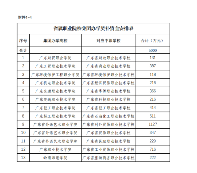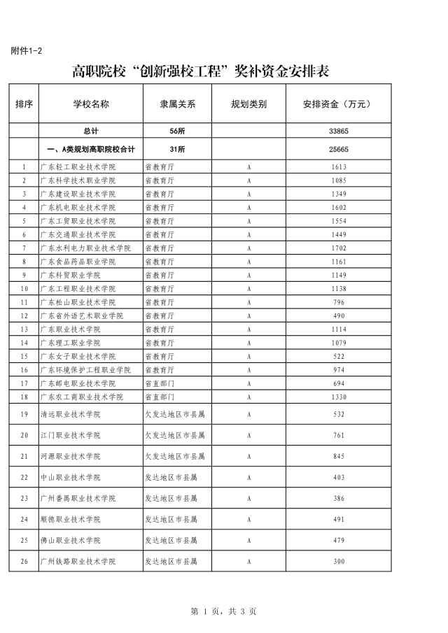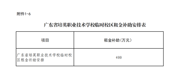 “创新强校工程”奖补资金33865万元,广东水利电力职业技术学院、广东轻工职业技术学院、广东机电职业技术学院3所学校奖补资金排在前三名,分别有1702万、1613万、1602万;省属职业院校集团办学奖补资金5000万元;经济欠发达地市中职学校发展奖补资金14405万元;培英职业技术学校临时校区租金补助400万元。