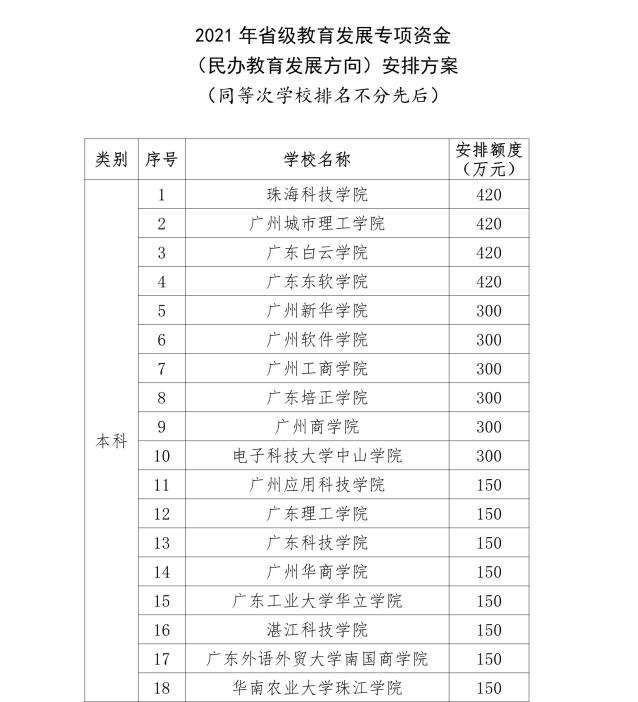 其中,本科高校珠海科技学院、广州城市理工学院、广东白云学院、广东东软学院,以及高职院校广东文理职业学院、广州华立科技职业学院、广东南方职业学院、广州华夏职业学院,8所学校分别收到420万元“大红包”。